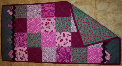 I was a little intimidated by the prairie points as I'd heard they were difficult, but I went full speed ahead anyway. I actually didn't have a problem with them at all. They were actually pretty fun. I fell in love with them and can't wait to add them to another project. I used fabrics I had on hand in pinks and greens. I machine quilted it with a simple pattern and added chocolate rick rack to finish it off. I still want to add buttons at the tips of the prairie points but haven't found any I like yet.